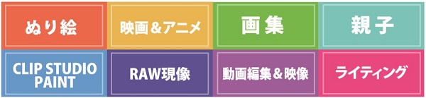 ぬり絵/映画・アニメのアートブック/マンガ家・イラストレーターの画集/親子でつくる工作/イラスト制作ソフト「CLIP STUDIO PAINT」の技法書/RAW現像の技法書/動画編集・映像の技法書/写真ライティングの技法書